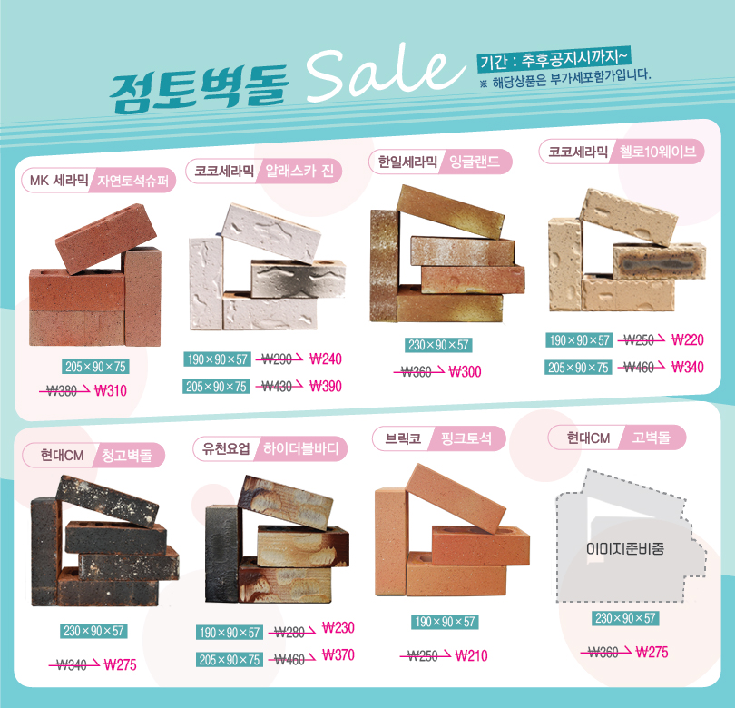 4월을 맞이하여 점토벽돌 특가할인 이벤트를 준비하였습니다. -기간 4월18일 ~ 추후 공지시까지 -할인품목 MK세라믹-자연토석(205*90*75) 380→310 코코세라믹 - 알래스카 진(190*90*57) 290→240 코코세라믹 - 알래스카 진(205*90*75) 430→390 한일세라믹 - 잉글랜드(230*90*57) 360→300 코코세라믹 - 첼로10웨이브(190*90*57) 250→220 코코세라믹 - 첼로10웨이브(205*90*75) 460→340 현대CM - 청고벽돌(230*90*57) 340→275 유천요업 - 하이더블바디(190*90*57) 280→230 유천요업 - 하이더블바디(205*90*75) 460→370 브릭코(청화) - 핑크토석(190*90*57) 250→210 현대CM - 고벽돌(230*90*57) 360→275